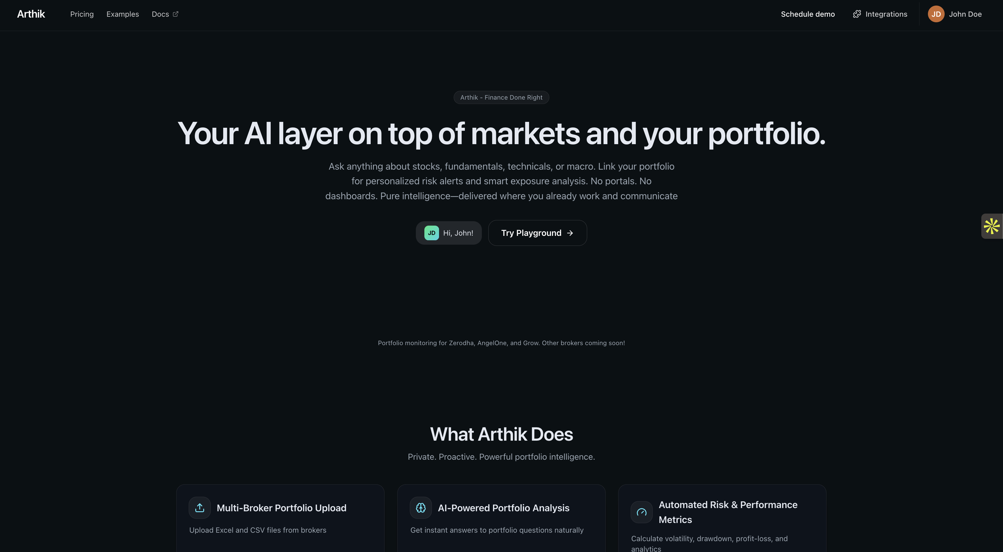 Arthik is an AI agent platform for finance that acts as an intelligent layer on top of markets and portfolios. It enables users to ask questions about stocks, fundamentals, technicals, or macroeconomics in natural language, and provides personalized portfolio insights without requiring portals or dashboards.